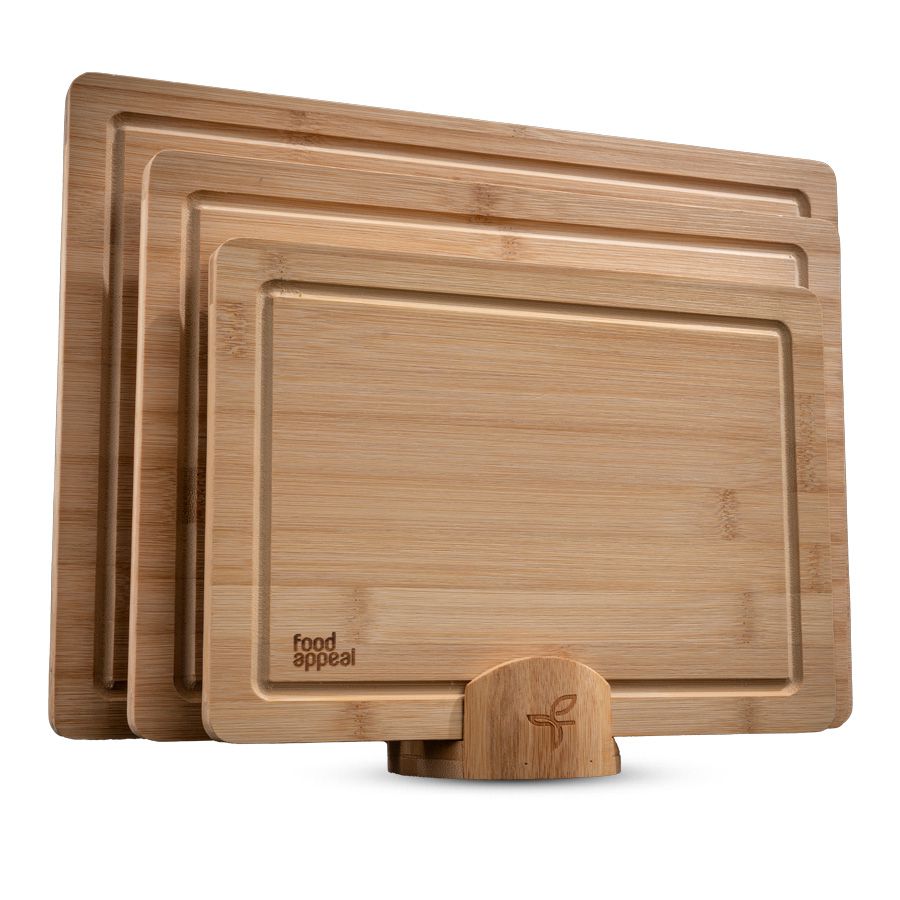 3 לוחות חיתוך בגדלים שונים, כך שתוכלו להיעזר בלוח המתאים ביותר לכל משימה במטבח – חיתוך ירקות, בשרים, לחמים ועוד. הסטנד העמיד שומר על הלוחות מסודרים ונגישים, מבלי שתצטרכו לחפש כל פעם את הלוח המתאים.